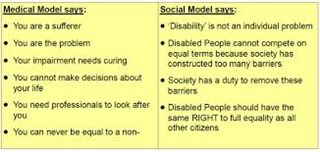 There is a really good quote that sums up the social model brilliantly. But I cant find it so I am going to paraphrase.