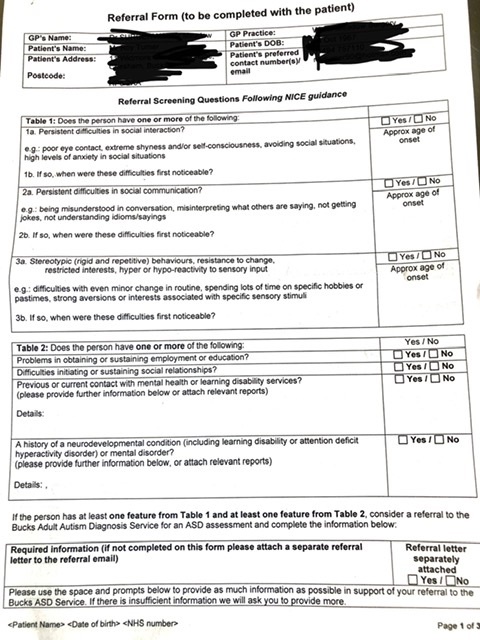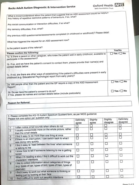 From what I can see, the forms aren’t for me to complete and  questions on a parent who can give information on my childhood is not really possible. My mother is my only surviving parent and is 76, she really doesn’t get what autism is and would see it as an attack on her parenting. I explained to her a few weeks ago about how much of my earlier school life was spent in remedial lessons. She was totally unaware of it. My sister is 10 years younger than me so can’t really help.