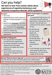 The first part of this study is an online survey. The survey asks questions to check whether this study is appropriate for you, asks demographic questions, and questions about OCD symptoms. In the second part of the study, you will be interviewed over Microsoft Teams or in person (depending on preference) about your experiences of autism-related repetitive behaviours and OCD symptoms.