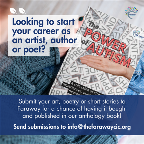 The Faraway CIC are commissioning autistics across the UK to submit works of art, poetry and short stories so that we can showcase it in an anthology book. We are currently calling it The Power of Autism Anthology. All submissions that meet the criteria and are used in the finished book will be paid £50 per work. Submissions are made to our email address, info@thefarawaycic.org with the email asking for usage within the book.
