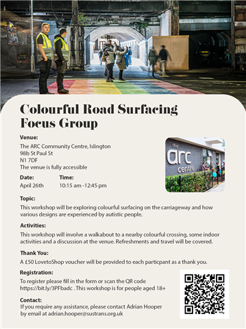 We would like to hear your experiences of and views on colourful road surfacing, as well as suggestions around their use. The workshop will involve a walkabout to a nearby colourful crossing, some indoor activities, and a discussion at the venue. Refreshments and travel will be covered, and participants will receive a voucher.