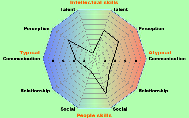 This matches my my attention to detail, pattern recognition and special interests (high atypical talent) and my need for predictability and my hypersensitivity (high atypical perception). I have what is maybe an unusual communication score for someone on the spectrum, however this is an ability to interpret and display typical non verbal communication - not as I originally thought, being ok at conversation. (Verbal communication is in the talent section of the typical side of the graph)