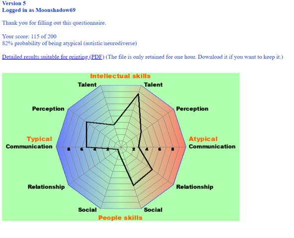 This test results in a 10 sided chart, showing how strong your atypical (autistic) and typical (neurotypical) traits are, which I find really interesting. For an example, here is my result: