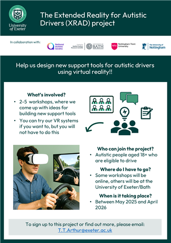 We are looking for up to 30 autistic people who are willing to help us come up with ideas for our new XR support tool. The activity is open to people aged 18+ who are eligible to drive (or could learn to drive) in the UK. Please note that we have now found enough qualified drivers but are still seeking people who who do not currently drive or have a license.