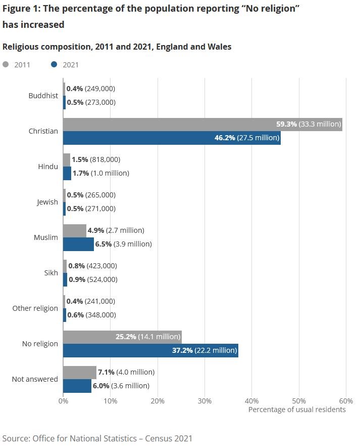 • The last National Statistics figures put Christanity at 46% in 2021 in the country but we had COVID then. 50% = majority usually.