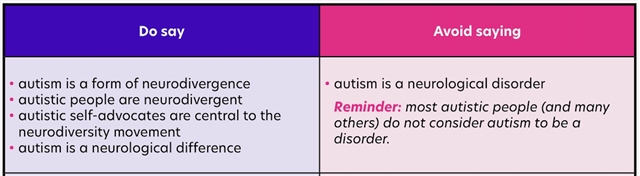 Side-note: for reasons I've explained previously (here and here), "neurodiverse" is not listed anywhere in the linked document's "Do Say" column. The top-left box refers to how neurodivergence and neurodivergent are the appropriate words to use, whilst the top-right and others discuss "disorder" and the autistic community's majority preference, in respect of your exchanges with  and  .