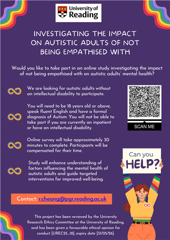 They are looking for autistic adults without an intellectual disability, who are 18 years old or above, speak fluent English and have a formal diagnosis of Autism. You will not be able to take part if you are currently an inpatient.