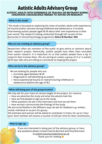 Please contact Sascha and Amy at autism.trauma.project@ucl.ac.uk if interested.