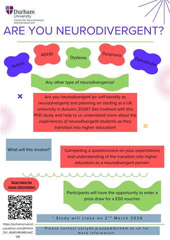 The study consists of a 15-20 minute online questionnaire and the option to complete a follow up questionnaire in June 2026. The criteria for participating is those that identify as neurodivergent (can be diagnosed, self-diagnosed, or on the diagnostic pathway) and that you are planning on starting university in the UK in Autumn 2026. Participants can enter a prize draw for a chance to win a £50 voucher at the end of the questionnaire.