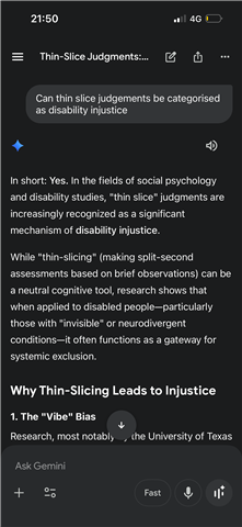 Someone highlighted what I might be experiencing might actually be related to thin slice judgements being made, because of my autism. Certainly some of this applies, but the definitions of disability injustice seem to fall exactly in line with how I viewed those situations.