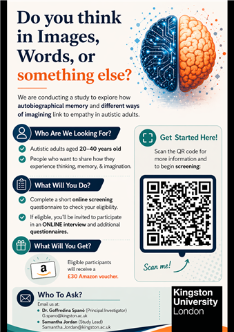 We are conducting a study at Kingston University exploring how autobiographical memory and mental imagery are linked to empathy in autistic and neurotypical individuals.