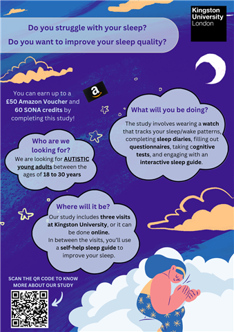 Participation involves wearing a sleep watch, engaging with the sleep resource, and completing sleep diaries, short online cognitive tasks and questionnaires. Everything can be done remotely, or in-person (if near Kingston), and participants will receive a £50 voucher for their time.