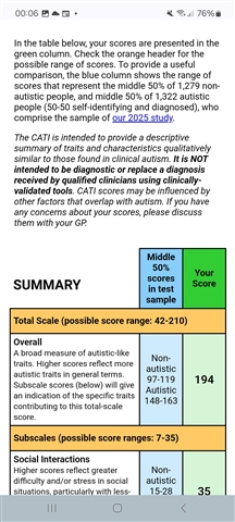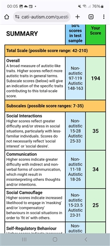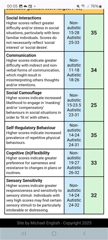 As usual I have very borderline scores except for stimming and sensory which score within autistic range only. Sensory probably would be higher if I wasn't partially deaf as unexpected loud sounds don't make me jump but as a child I could not stand prolonged loud sounds that other people handled fine. My overall score is 141 which falls in the hole between the non autistic and autistic ranges