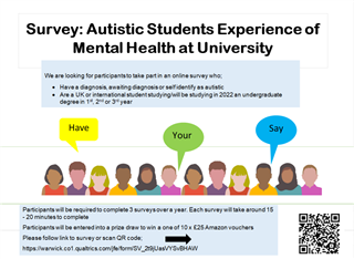 The opportunity below is research looking to improve the mental health experiences of autistic students at University. To answer the survey scan the QR code or click here.