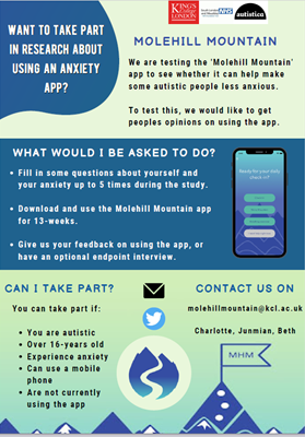 Final call! We have an opportunity for autistic people aged 16 and above to use the app, 'Molehill Mountain'. The app was designed to help support autistic people with anxiety and we want to find out your opinions on it. There are now only a few spaces left to join the study. Please see our study advert for more information and our contact details.