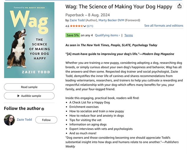 If you are interested in knowing more about cultivating your relationship with your dog using the latest ethical methods backed up by science, I recommend this book. It is not a training book (although it does explain how dogs learn and how to train using reward based methods), rather it explains the science (in easy to understand language), of how behaviour is driven by consequences, and how to bring bring happiness to your dog’s life (and hopefully to yours).