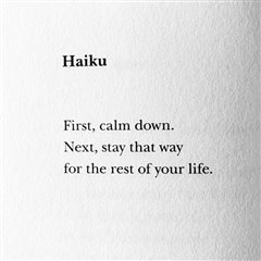 It's a good one. But how do you then calm down those around you. Teaching English and advising people (in the country where I live are essentially both a total waste of time. Forget communicating directly a desire to calm things down. But perhaps a few haikus in the first and second local language might work better. Posted up for random reading, rather than read out aloud. Public speaking here really is the best form of mass hypnosis. ;-) But that gives me an idea: Haikus as a suggestion, under hypnosis