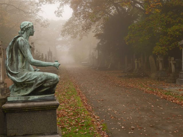 I have visited my parents graves in foggy weather and in the snow and at dusk. Great creepy atmosphere.