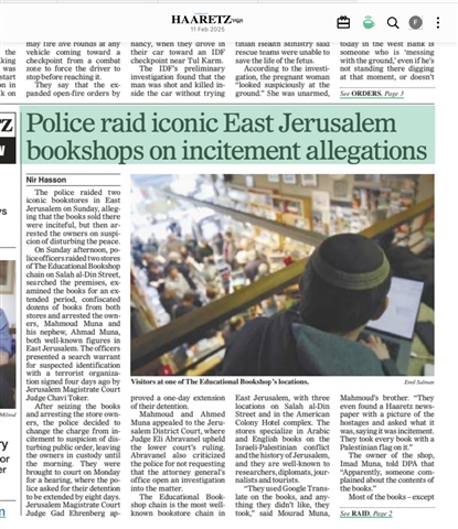 • Today’s ’Haaretz’ reports that Israeli police arrested two lovely people I know and care about. I used to spend much of my free time in this shop when I lived in Jerusalem. It is owned by Arab Palestinians but good customers have always included israeli Jews and Palestinians, along with many oversees visitors and well known british journalists. Rarely would this sort of thing make the news, but the raid and arrest was also reported by the BBC, probably because BBC journalists stay nearby and rely on this shop. Sadly, these sort of raids but worse are happening all over the West Bank, but the Gaza situation deflects attention. I don’t care about sides, I care about human rights abuses.