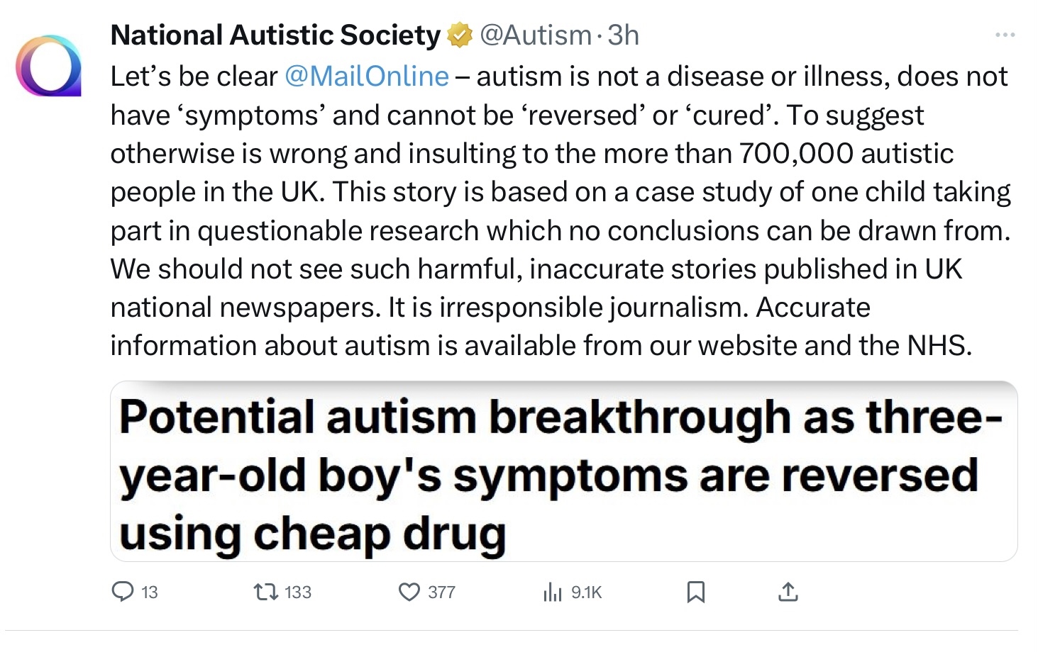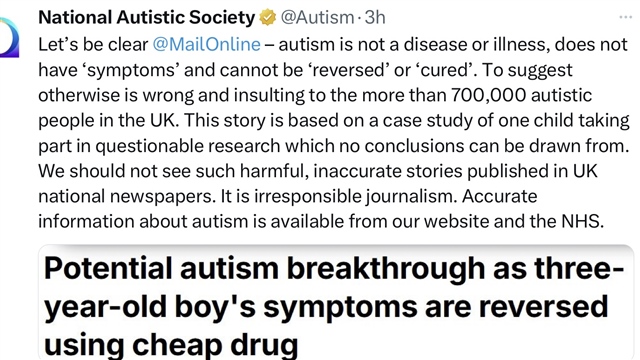 The NAS firmly rebutted the MailOnline’s portrayal of autism as a disease in a Tweet today. A search online can easily bring up headlines claiming autism reversal has happened or has the potential to happen in the near future.
