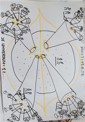 I'm recently very much into universe multiverse, theories, also quantum physics.  I listen to the astrophysicist Neil Tyson de Grasse and I love listening to him. And some time ago I heard a theory, that maybe our universe is inside of a black hole. According to Einstein theory black holes host their own space time, they preserve matter, electric charge and angular momentum, which would allow galaxies to develop. And here it could also answer the Fermi paradox: where is everyone? Maybe we don't hear anyone, because maybe we are alone in our universe (black hole) there might be also different explanations, like aliens using telepathy instead of radio waves for communication.  I drew some series of pictures related to this topic. I'm curious, if there is anyone Aldo interested with this topic and what are other people's thoughts.