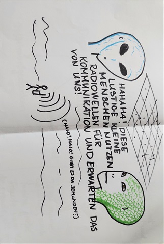 Here it says "haha these funny little humans use radio waves for communication and expect the same from us."