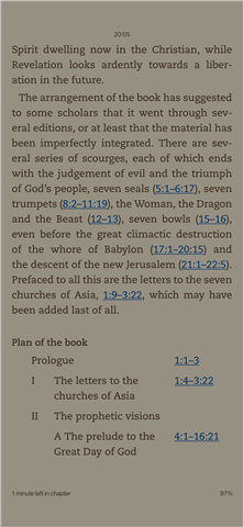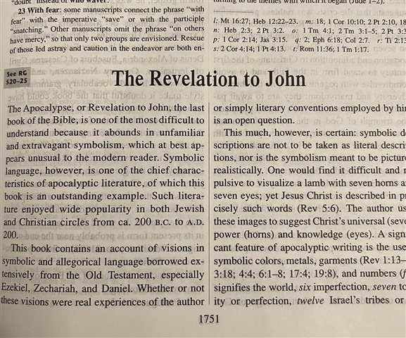 The Book of Revelation is a literary genre known as Apocalyptic writing. It reveals a transcendent reality which it temporal and spatial. It was a common form of writing in some Jewish communities that appears in other parts of the Bible. Revelation was addressing a community under persecution and it employs much symbolism and metaphor. These are screenshots from three separate sources, describing how Revelation can be read.