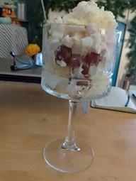 Mine comprises: ice cream, clotted cream, mini marshmallows, merangues, banana, grapes, squirty cream, dessicated coconut. For Easter, Illl add chocolate sauce & forest fruit coolis.