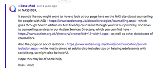 I also have thought about support for my sons from various "experts" as I don't feel like I'm equipped to deal with some of the issues we have and certainly want to help my children navigate this as much as possible.  I think when you have a diagnosis, you take it more seriously.  And unfortunately with my elder son not being diagnosed, I have focused on ADHD rather than ASD/Aspergers.  However recently he has really been struggling with self-esteem, separation anxiety and perhaps low level depression.  When I say that we will look to get help externally, he is very against this.  He was even very resistant to have the assessment which took place at home & I have a feeling he didn't answer the questions as honestly as he could have.