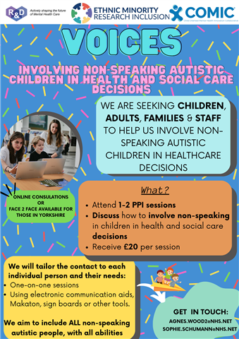 Our research team at Leeds and York Partnership NHS Foundation Trust are looking to get in contact with non-speaking autistic people (children or adults), or people that have experience working with or caring for non-speaking autistic people, to ask questions about their experiences with being involved in care decisions or their feelings around visiting health and social care settings, and what could be done to improve these. We also want to ask questions about preferred communication methods, and gather opinions on our study.