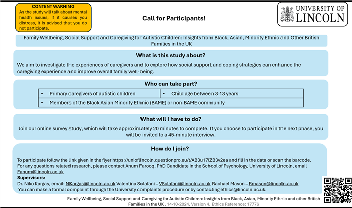 My name is Anum and I am a PhD student at the School of Psychology, University of Lincoln, conducting research on “Family Wellbeing, Social Support, and Caregiving for Autistic Children: Insights from Black, Asian, Minority Ethnic, and Other British Families in the UK.” If you are a parent or caregiver of an autistic child in the UK, we invite you to take part in a short online survey that takes approximately 20 minutes to complete. Your participation will help us understand diverse caregiving experiences and inform better support systems for families. Please click here to access the survey: https://unioflincoln.questionpro.eu/t/AB3u17lZB3v2ea Thank you for your time and support.