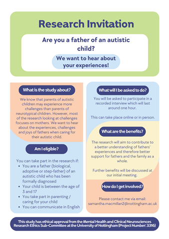 We are researchers from the University of Nottingham. We want to understand the experiences, challenges and joys of fathering an autistic child. We are inviting fathers of children aged 3-17 to take part in an interview (online or in-person), and can offer £15 as a ‘thank you’. If you would like to take part or have any questions please email Samantha.Macmillan2@nottingham.ac.uk