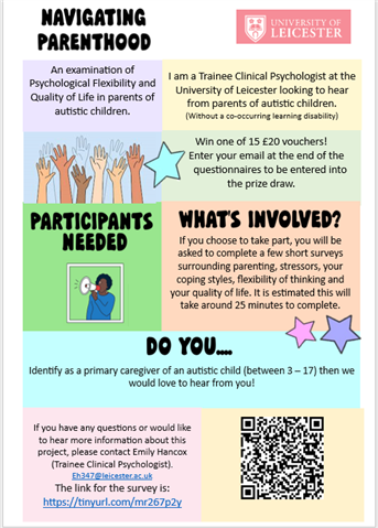 Are you a parent of an autistic child between the ages of 3 and 17 (without a co-occurring learning disability)? We invite you to take part in a research project aimed at understanding and improving quality of life for parents like you. This project is being conducted by a Trainee Clinical Psychologist, Emily Hancox (eh347@leicester.ac.uk), at the University of Leicester; this study focuses on the unique challenges faced by parents of autistic children.