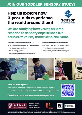 The SENSOR project, funded by the Wellcome Trust, aims to investigate the development of children’s processing of and response to everyday sensory experiences such as seeing, hearing, and touching. For example, why some children behave differently in response to everyday visual, tactile, and auditory sensory input, such as hating the feeling of a clothing label on their jumper or being very sensitive to bright lights. Long term, we hope this will guide how to best support children with sensory-related difficulties, which may be particularly relevant to autistic children and children with ADHD. Taking part involves completing some online surveys and visiting us at the Toddlerlab at the Centre for Brain and Cognitive Development, Birkbeck College, in London, where we will do lots of different cognitive and neuroimaging assessments with your child, including some using virtual reality technology! We currently looking for three-year-olds and their families to participate. Please email cbcd-sensor-study@bbk.ac.uk to learn more or show interest in taking part.