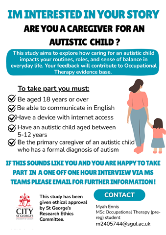 This research aims to explore the lived experiences and daily occupations of primary caregivers of autistic children. The study is led by Myah Ennis MSc Occupational Therapy Student at City St Georges University London.