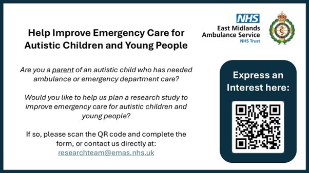 We are a team of UK researchers working with ambulance services and emergency departments, looking to improve emergency care for autistic children and young people. We understand how stressful unplanned emergency care can be for autistic children and young people and their families, and we want to explore what could make ambulance and emergency department care work better for them. We are designing a research study to explore the experiences of autistic children and young people, their parents/carers, and emergency clinicians, and we need your help to plan it.