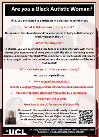 This study aims to understand some of the experiences of autism amongst black women in the UK as this is a very important but significantly under researched area. This project aims to recruit 12 participants to share their experiences and contribute to this research.
